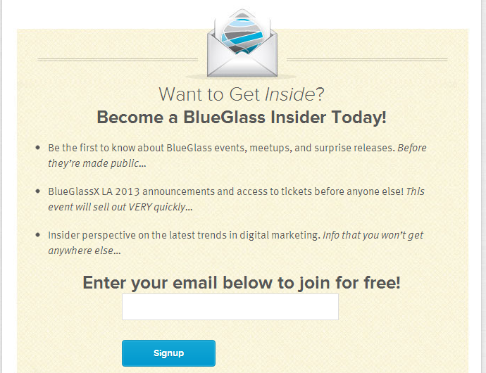 And from BlueGlass marketing at the bottom of a blog post an offer of insider information.  Good use of italics and bold and three strong offers.